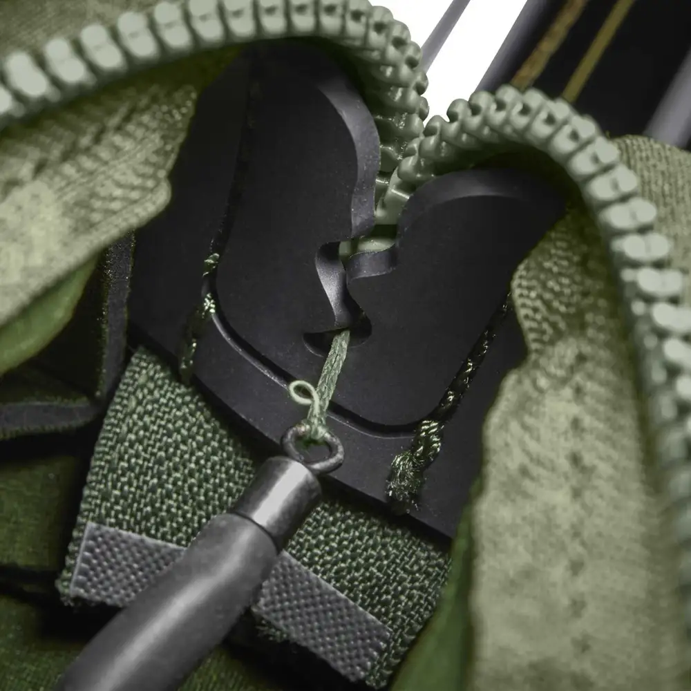 Legen Sie am Ende Ihrer Session die Feeder- oder Marker-Pose in das Holster, legen Sie die Vorfach- oder Hauptschnur vorsichtig in den speziell entworfenen Gummideckel, schließen Sie den Reißverschluss, um den Inhalt zu sichern, und befestigen Sie dann den einen Klettverschluss oben an der Rute gleich neben dem ersten Schnurführungsring. Dann wird die Rute in der üblichen Weise getrennt und das Holster mit dem schützenden Neopren-/Klettband an der Rute befestigt.